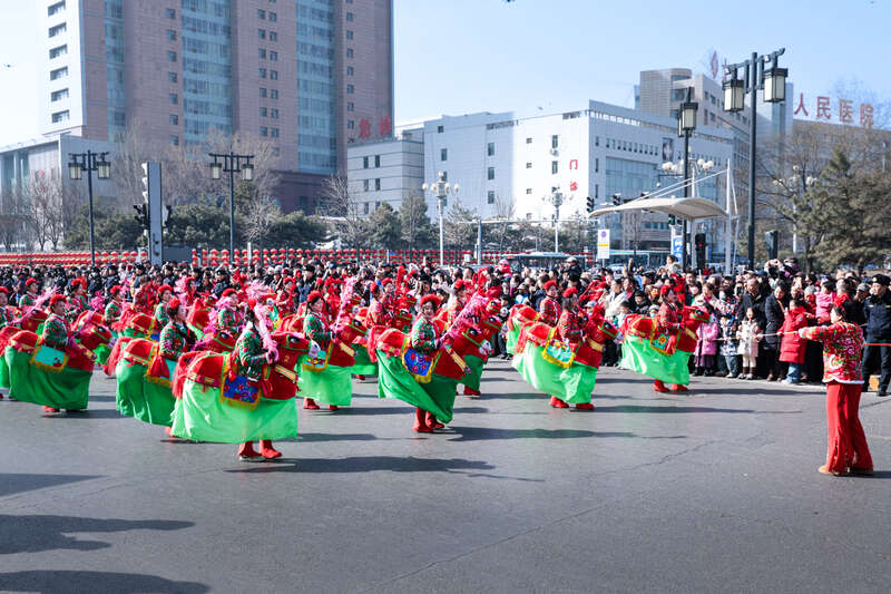 翠裙红袄的秧歌队伍在街头整齐舞动,裙摆翻飞间如花海翻涌。