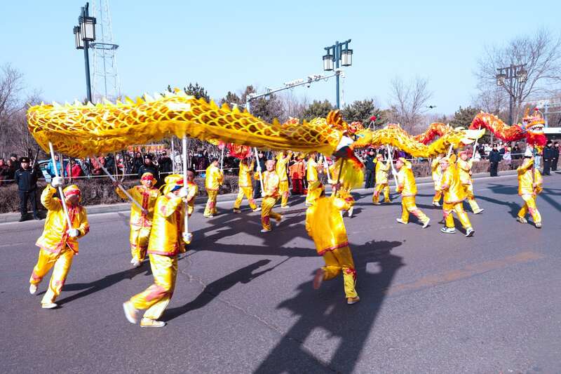 舞龙队伍身着金黄劲装,手举龙杆奋力腾跃。金色长龙在街头蜿蜒起伏,如游龙戏珠般灵动,每一个动作都饱含着祈愿风调雨顺、国泰民安的美好祝福。