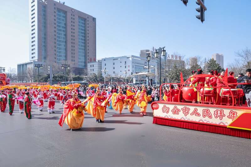 写有“向全市人民拜年”的彩车引领着巡游队伍前行,红黄相间的表演方阵紧随其后。