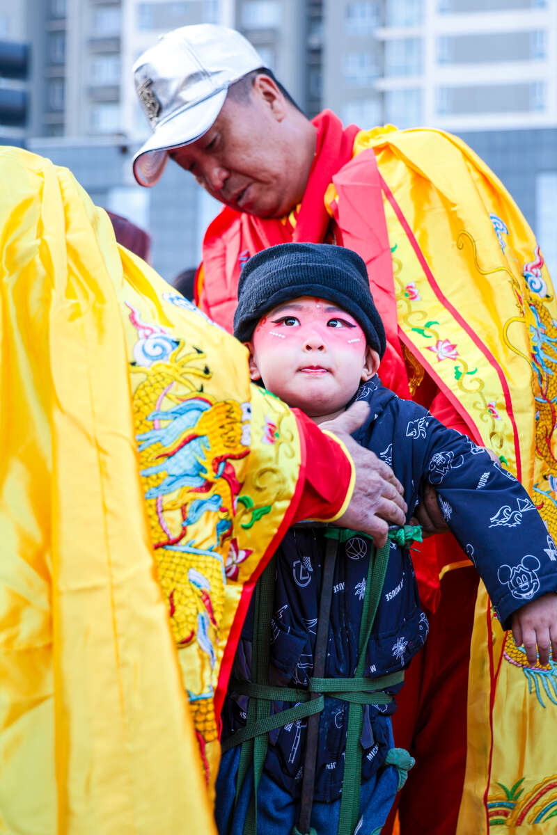 社火现场,身着绣龙黄衣的表演者温柔护着满脸红妆的孩童。孩子懵懂的神情与表演者的呵护相映,这一瞬间定格了民俗文化的代际传承,让社火的种子在童真中悄然扎根。