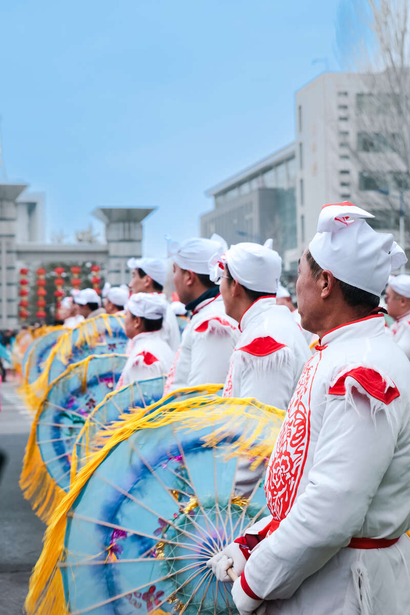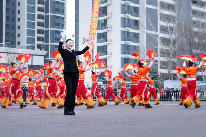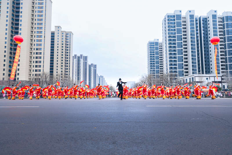 林立的高楼间,社火表演队伍列阵排开,火红服饰如燎原星火般铺展。
