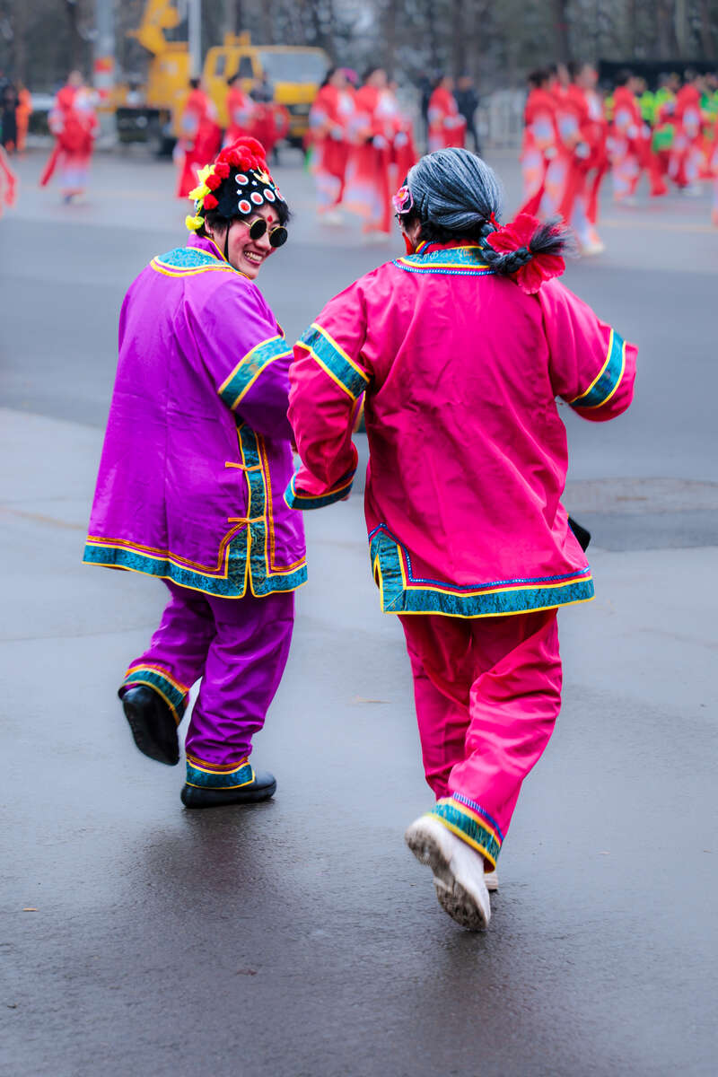 两名反串表演者身着紫、红彩衣,迈着欢快的步伐穿梭在巡游现场。夸张的装扮与灵动的姿态逗趣十足,成为榆次社火中一道诙谐的风景线,点燃街头欢乐氛围。