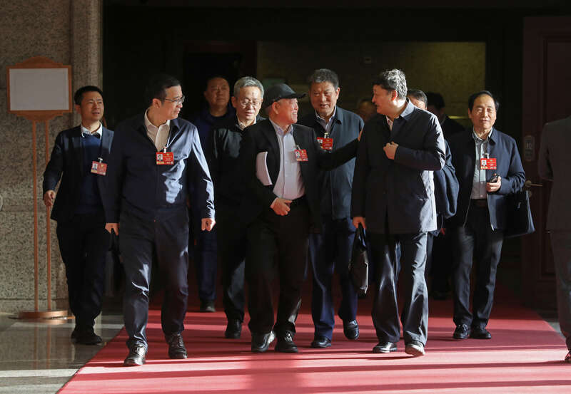 3月9日,北京会议中心,全国政协十四届四次会议小组会结束后,来自科协界别和其他界别的委员们走出会场。全国政协委员、中国科学院院士朱日祥(中)与身旁的全国政协委员、中国工程院院士邱志明交流。中青报·中青网记者 陈剑/摄