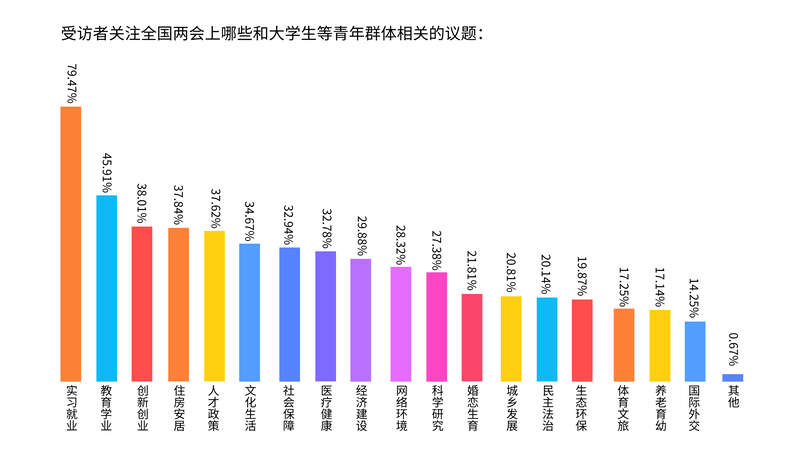 2026年全国两会召开之际,中国青年报·中青校媒面向以大学生为主的青年发起问卷调查,了解他们关注的两会议题,共回收1797份有效问卷。调查结果显示,实习就业(79.47%)、教育学业(45.91%)、创新创业(38.01%)、住房安居(37.84%)、人才政策(37.62%)等议题备受关注。详情