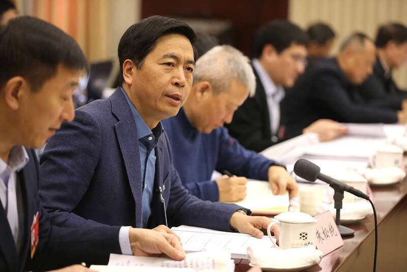 3月6日,北京会议中心,全国政协十四届四次会议科技界别小组会,全国政协委员、北京通用人工智能研究院院长朱松纯(左二)发言。今年全国两会,他围绕人工智能产业发展、人工智能人才培养等主题建言献策。中青报·中青网记者 陈剑/摄