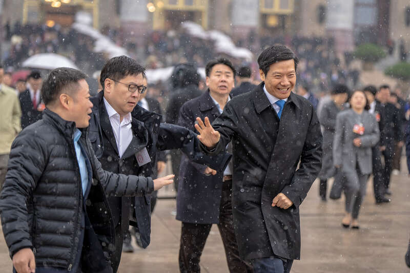 3月4日,北京人民大会堂外,十四届全国人大四次会议预备会议后,全国人大代表,小米集团创始人、董事长兼首席执行官雷军(右一)走出会场。今年全国两会,他围绕“人工智能+”与“新质生产力”话题,就人形机器人、智能汽车、科技公益、复合型人才培养等领域提出建议。中青报·中青网记者 李隽辉/摄