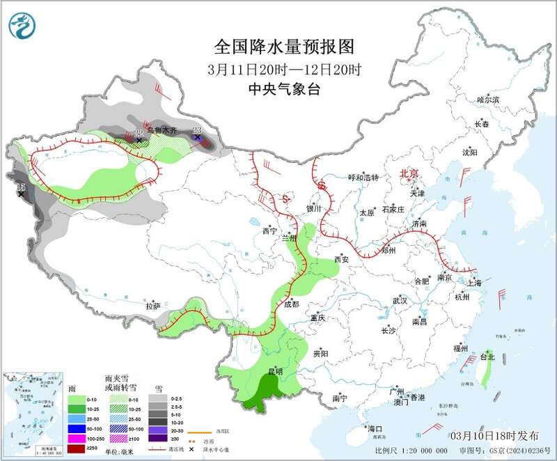 据中央气象台,3月11日20时至12日20时,新疆北部和南疆西部山区、西藏西部等地部分地区有小到中雪或雨夹雪,其中,新疆沿天山等地部分地区有大到暴雪,局地大暴雪(20~23毫米)。新疆南疆盆地、甘肃南部、宁夏南部、四川盆地、云南大部、贵州西部等地部分地区有小雨,云南南部局地有中雨。新疆大部、甘肃河西、内蒙古西部等地部分地区有4~6级风;东海大部海域、台湾海峡、南海东北部海域有6~7级大风、阵风8级。甘肃河西、宁夏、内蒙古中西部有扬沙或浮尘,局地有沙尘暴。