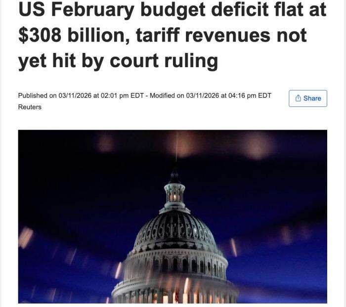 中新网3月12日电 据路透社当地时间3月11日报道,美国财政部发布的数据显示,美国2026年2月政府预算赤字为3080亿美元。