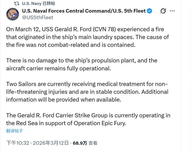 美国海军在“X”平台的官方账号第一时间转发了美军中央司令部与第5舰队发布的消息。相关帖文提到,起火位置是舰上的主洗衣房,航母的推进装置没有受损,仍然可以正常运作。两名水兵在事故中负伤,他们已经接受治疗,“情况稳定,没有生命危险”。