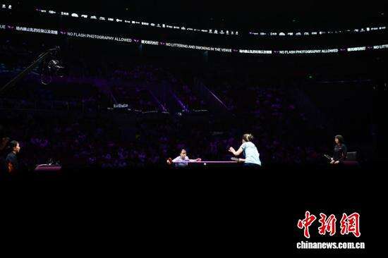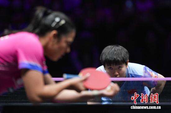 孙颖莎(右)在八分之一决赛中对阵波多黎各选手阿德里安娜·迪亚兹。
