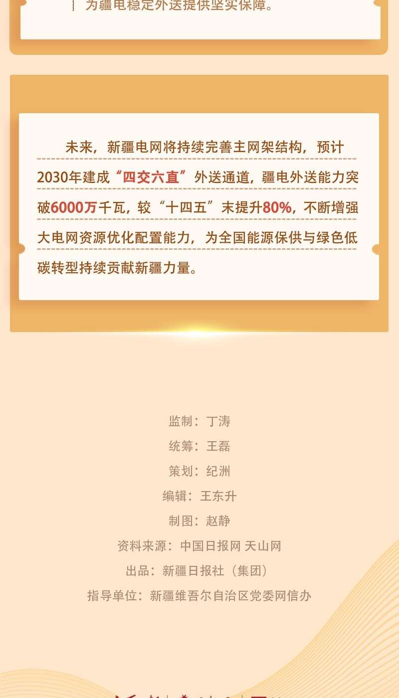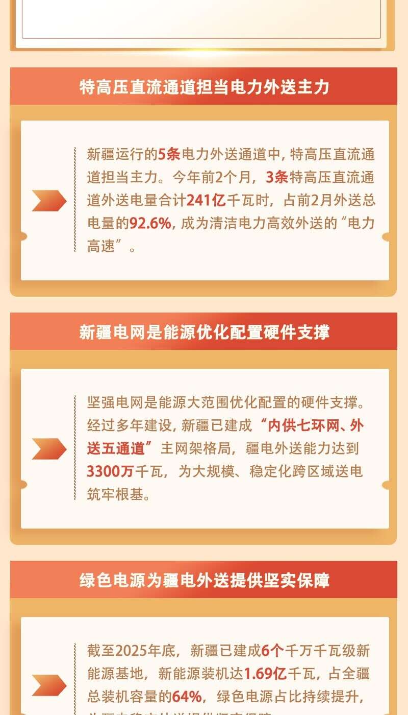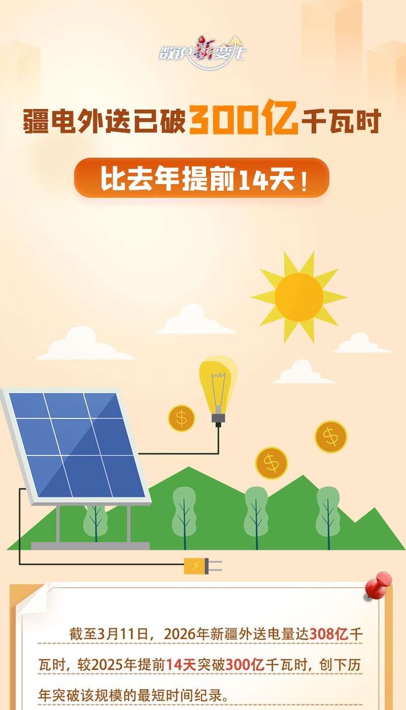 截至3月11日,2026年新疆外送电量达308亿千瓦时,较2025年提前14天突破300亿千瓦时,创下历年突破该规模的最短时间纪录。这一优异成绩是如何取得的?新疆作为国家“三基地一通道”和全国能源资源战略保障基地做了哪些努力?今天的《数说“新”变化》一起来看看。
