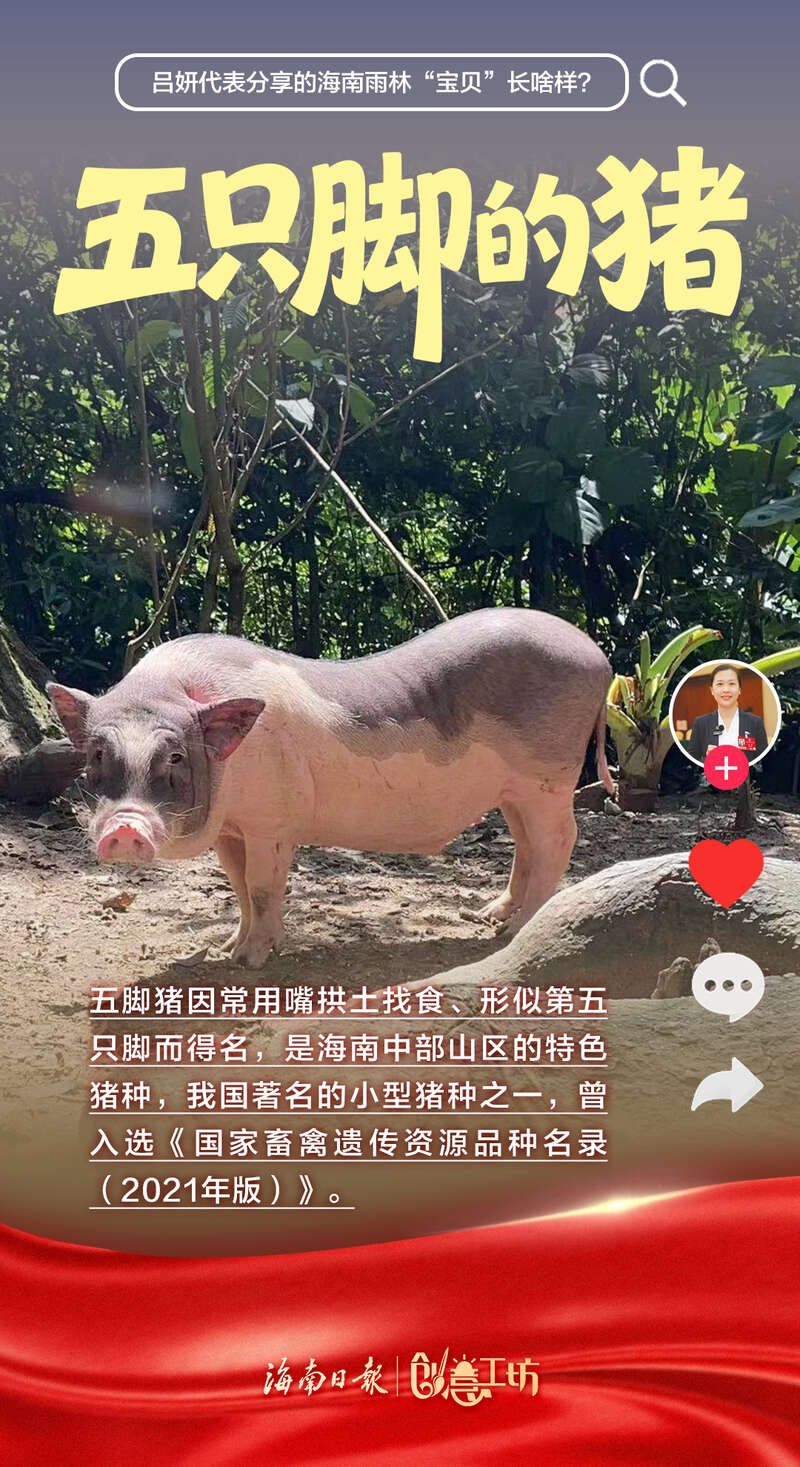 3月12日,十四届全国人大四次会议第三场“代表通道”在北京人民大会堂举行。全国人大代表,海南省保亭黎族苗族自治县委常委、副县长吕妍走上“代表通道”,向全国人民分享了海南雨林“宝贝”——能煲汤的五指毛桃、能做药的益智、会上树的鸡、不回家的牛、会冲浪的鱼、五只脚的猪。