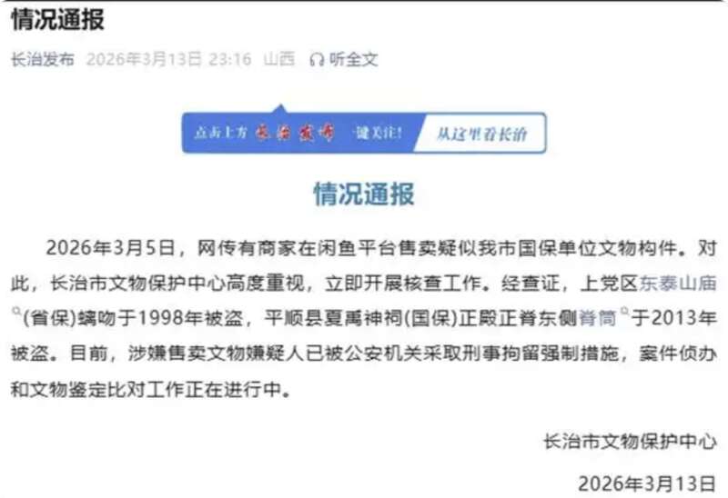 据山西省长治市微信公众号“长治发布”消息,3月13日,长治市文物保护中心发布情况通报称,3月5日,网传有商家在闲鱼平台售卖疑似我市国保单位文物构件。对此,长治市文物保护中心高度重视,立即开展核查工作。经查证,上党区东泰山庙(省保)螭吻于1998年被盗,平顺县夏禹神祠(国保)正殿正脊东侧脊筒于2013年被盗。目前,涉嫌售卖文物嫌疑人已被公安机关采取刑事拘留强制措施,案件侦办和文物鉴定比对工作正在进行中。