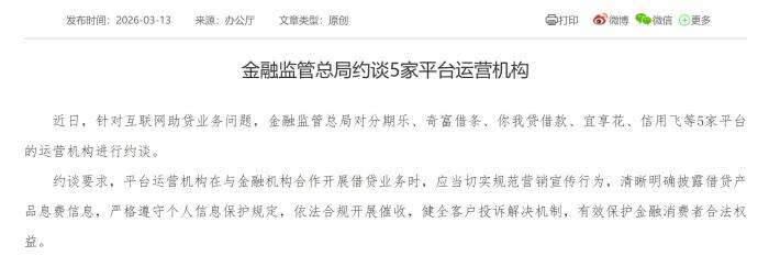 3月13日,国家金融监管总局发布消息称,近日,针对互联网助贷业务问题,金融监管总局对分期乐、奇富借条、你我贷借款、宜享花、信用飞等5家平台的运营机构进行约谈。同日,金融监管总局金融消费者权益投诉调解中心、中国消费者协会、中国互联网金融协会联合发布三则案例,提醒广大消费者警惕诱导付费和高融资成本陷阱,增强辨别能力和风险防范意识。