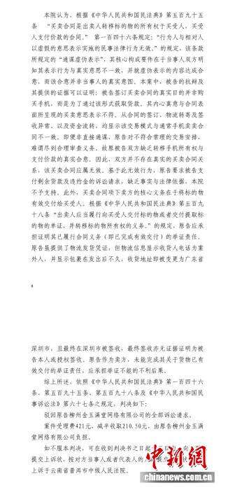 孙乐出具的法院判决书显示,法院审理认为,被告的抗辩及其提供的证据可以证明:被告签订买卖合同的真实目的并非购买手机,而是为了通过该形式获取贷款。其内心真意与合同表面所呈现的买卖意思表示不符。从合同的签订,物流转寄及签收异常,以及资金流转,均显示该交易模式与通常手机买卖合同不一致。即便非直接通谋,原告对不符合常理的交易安排,难谓尽到合理审查义务。故原被告双方缺乏转移手机所有权与支付价款的真实合意。因此,双方并不存在真实的买卖合同关系,该买卖合同应属无效。