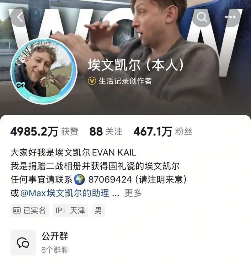 目前,埃文·凯尔在多个社交平台开设账户,分享他在中国的所见所闻。其中,他曾在直播中称在天津有了家的感觉,因为天津的建筑风格与自己的老家很像,有一种强烈的归属感。