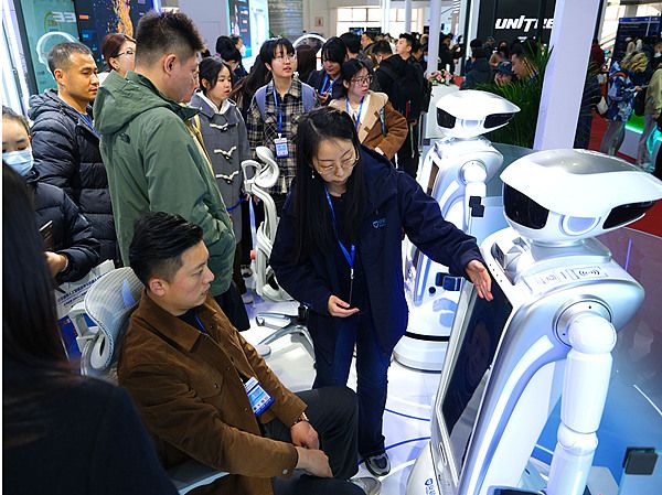 2026年3月18日,北京,观众在AI Show 2026展馆与健康监测机器人互动。