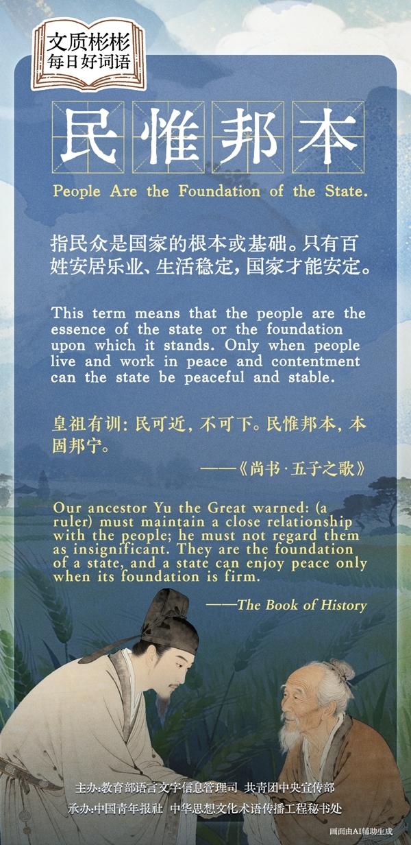 皇祖有训:民可近,不可下。民惟邦本,本固邦宁。(《尚书·五子之歌》) (我们的祖先大禹曾经告诫说:民众可以亲近,不能认为他们卑微。民众是国家的根本,根本稳固了国家才能安宁。)