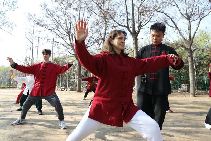 3月20日,外籍学员在陈家沟村内跟随教练练拳。新华社发 徐宏星 摄