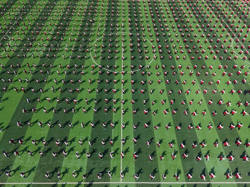 3月20日,河南省焦作市温县一中学生在课间操时间集体习练太极拳(无人机照片)。新华社发 徐宏星 摄