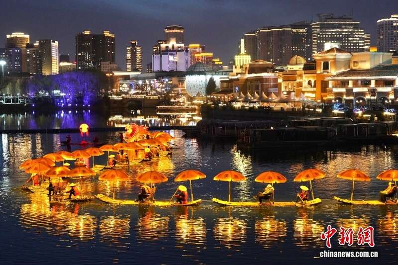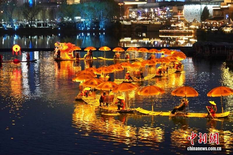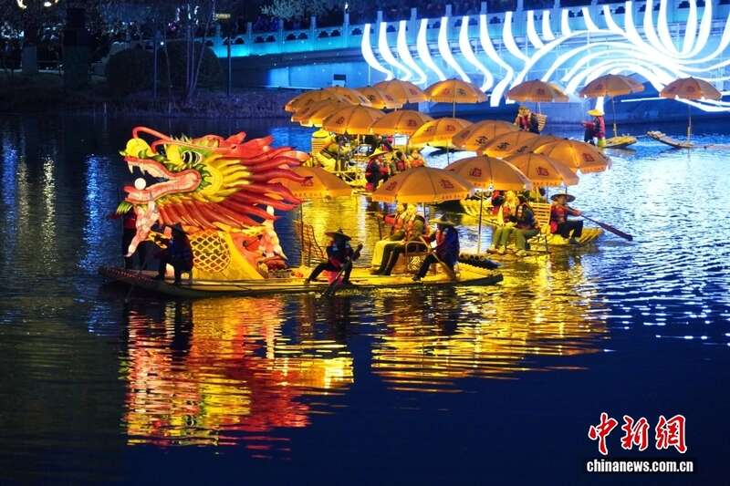 3月22日,桂林阳朔金龙巡游亮相北京亮马河,由36艘竹筏组成金龙造型,总长241.2米。流光龙影与河畔灯火交相辉映,非遗底蕴与都市活力有机交融,为亮马河添上一抹非遗水上盛景。