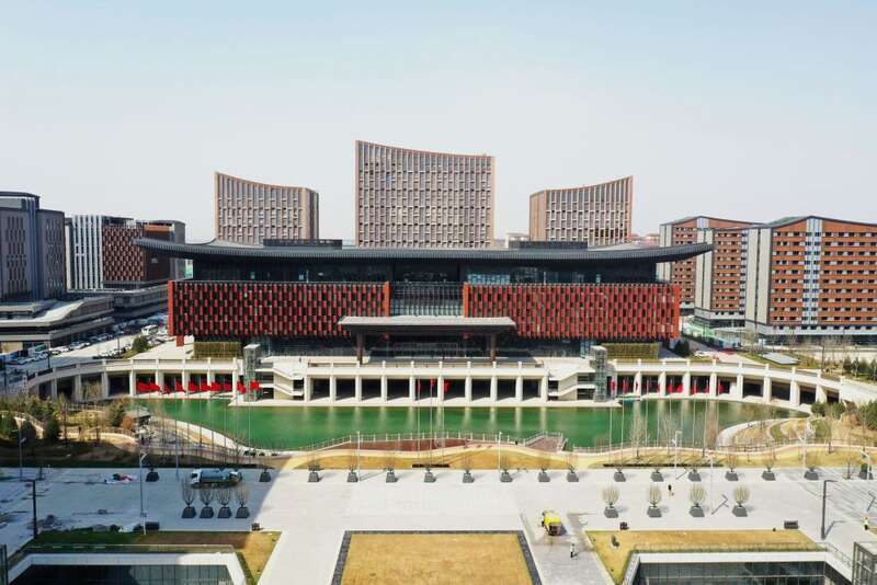 雄安商务服务中心是新区首个标志性城市建筑群,建筑风格以东方美学立体展现雄安特色风貌,功能包括酒店、专家公寓、商业等。2022年底,该中心投入使用。通过绿色建筑技术的集成与创新,这里实现了绿建三星标准全覆盖,项目预计每年可节约用电1100万度。这是2022年3月28日拍摄的雄安商务服务中心。