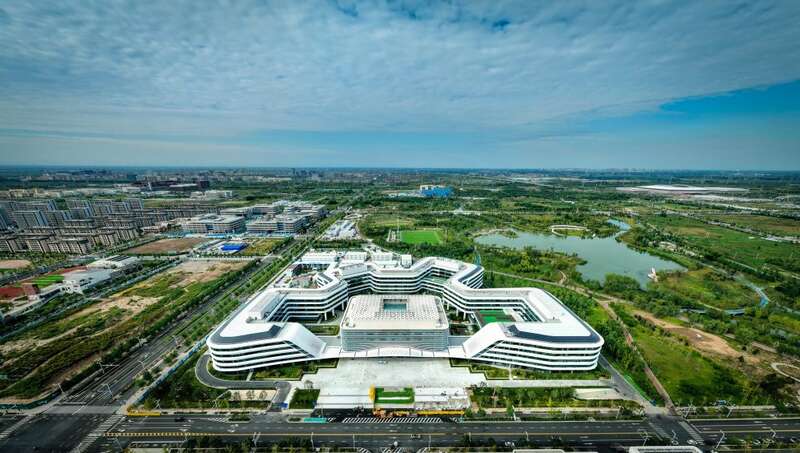 2023年6月30日,中共中央政治局召开会议,审议《关于支持高标准高质量建设雄安新区若干政策措施的意见》。此后,一揽子特殊支持政策陆续落地雄安新区。2023年10月16日,雄安宣武医院开诊。首都医科大学宣武医院派来管理团队及骨干医生,重点服务疏解人员和新区群众,并辐射京津冀地区。这是2023年9月30日拍摄的雄安宣武医院(无人机照片)。