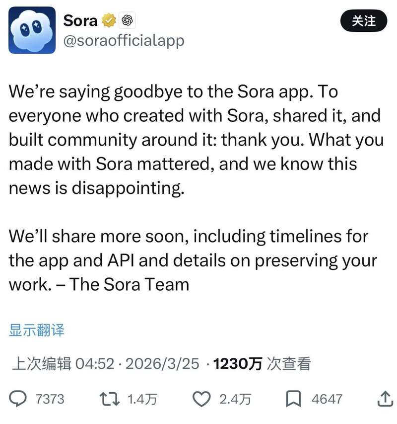 中新网3月25日电(记者 吴家驹)北京时间3月25日,OpenAI旗下视频生成模型Sora团队发布公告称,Sora应用程序即将关停,后续将公布包括应用和API停用时间表以及如何保存现有作品等在内的更多信息。