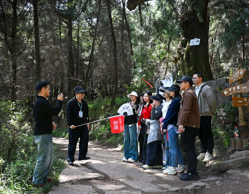 参加活动的青年们在参天古柏间参加古柏保护知识问答。共青团广元市委供图