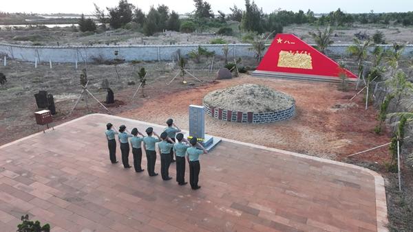 官兵们此行的第一站是渡海作战的出发地灯楼角。这里位于广东省湛江市徐闻县角尾乡,自古便有“极南”之称。如今在这里有一座面朝大海、种满木棉的渡海作战纪念园,园中一座渡海作战纪念碑巍峨矗立,旁边是7位无名烈士的合葬坟茔。