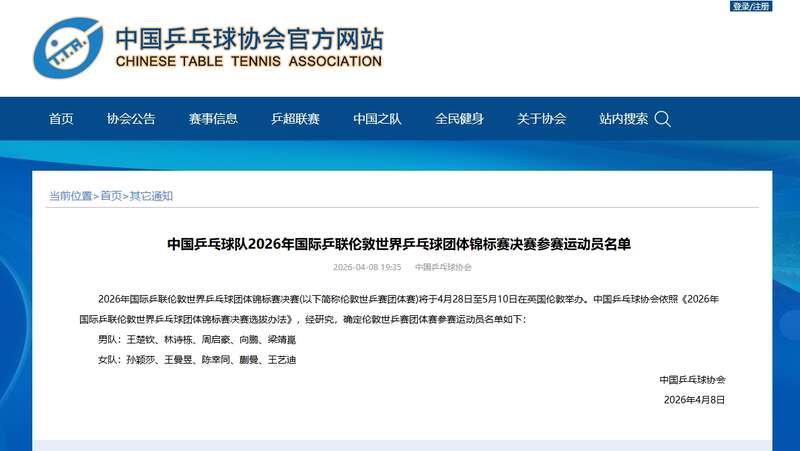 中国青年报客户端北京4月8日电(中青报·中青网记者 慈鑫)中国乒乓球协会今天公布了即将参加伦敦世乒赛团体赛的中国队名单。男队由王楚钦领衔,女队由孙颖莎、王曼昱领衔。具体名单如下: