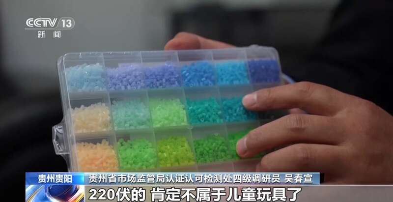 在贵阳市南明区一家玩具店,执法人员发现了一款“拼豆”玩具,套盒内配有一个外接220伏市电的小熨斗。在观山湖区一处批发市场,执法人员同样发现了这个问题,“拼豆”玩具配套的加热器件是外接市电的加热板。根据我国《电玩具的安全》国家标准,玩具应为电池玩具、变压器玩具或者双电源玩具,其供电电压不应超过24伏。当玩具以额定电压供电时,其任何两个部件之间的工作电压不应超过24伏。