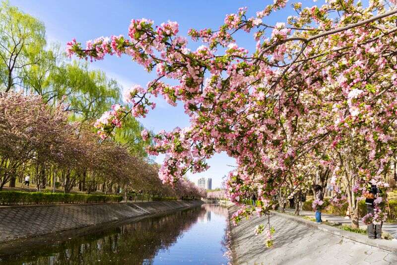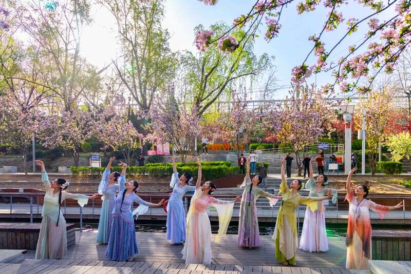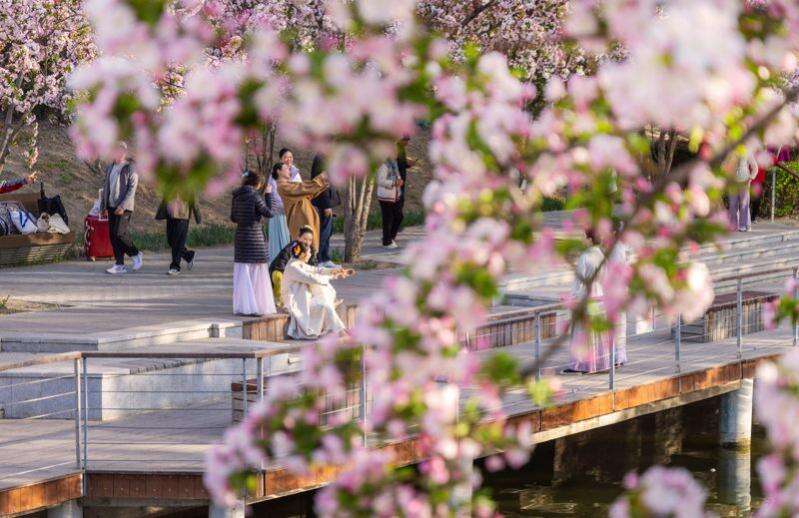 On April 5, 2026, the Wangjing Begonia Blossom Creek in Beijing reached its best viewing period. Against blue skies and white clouds, the stunning scenery drew crowds of residents eager to capture spring's beauty.(Photo/ VCG)