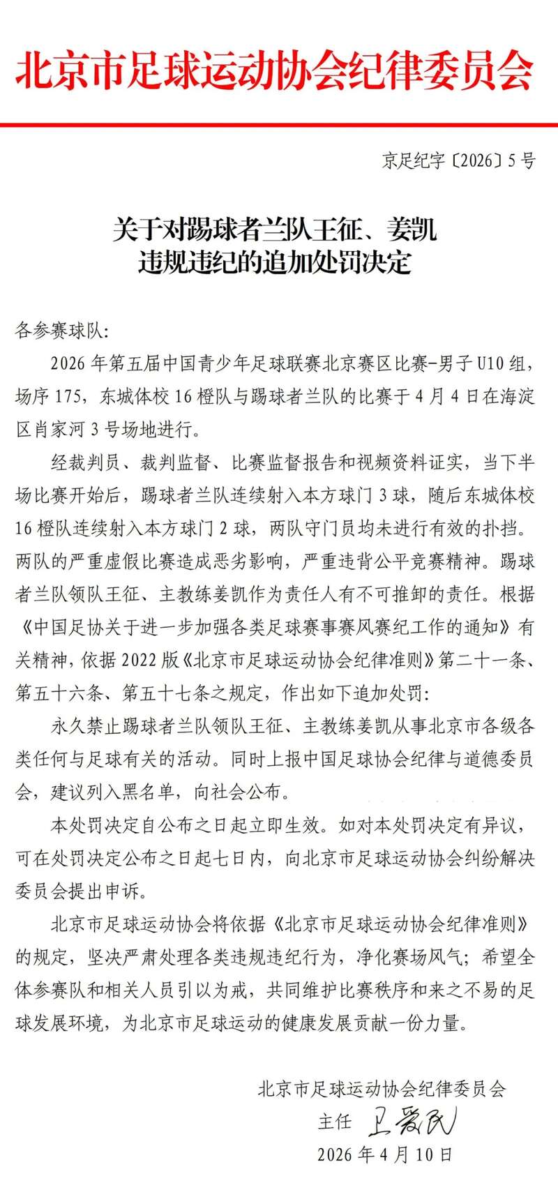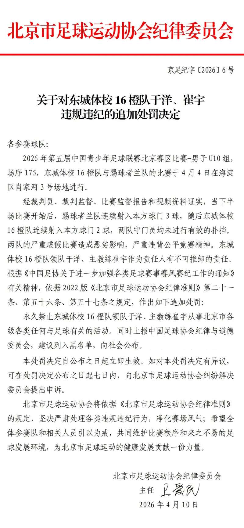 中国青年报客户端北京4月10日电(中青报·中青网记者 李梓昂)4月9日,北京市足球运动协会(以下简称“北京足协”)开出4张罚单,处罚2026年第五届中国青少年足球联赛(以下简称“中青赛”)北京赛区男子U10组出现的消极比赛行为。4月10日,北京足协发布追加处罚,永久禁止涉假教练员和领队从事北京市各级各类任何与足球有关的活动。