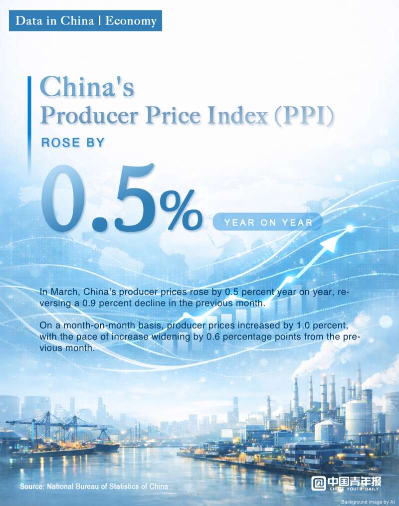 Affected by a rapid rise in international commodity prices and improving supply-demand conditions in some domestic industries, China's producer price index (PPI) rose by 0.5 percent year on year and by 1.0 percent month on month in March. This marks the sixth consecutive monthly increase, with the pace of increase widening by 0.6 percentage points from the previous month to reach the fastest growth in 48 months.