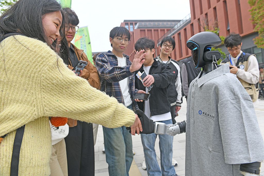 2026年4月11日,安徽淮南,安徽理工大学举办校园文化与科创成果展,大学生们在活动现场观看机器人表演,体验非遗手工制作和机器臂抓取物品等科学游戏互动。