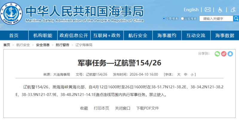 据中国海事局网站消息,大连海事局发布航行警告,4月12日16时至26日16时,渤海海峡黄海北部执行军事任务,禁止驶入。