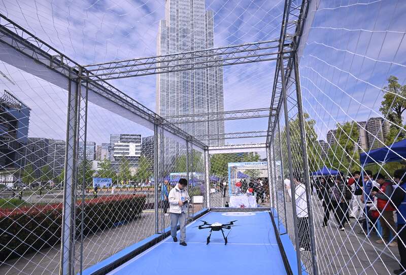 4月11日,四川成都,一场无人机运动会在四川省成都市高新区新川之心机器人公园开赛。本次赛事汇聚高校、企业及青少年科技力量参与,现场设置的无人机举重、击剑、篮球等特色赛项,上百支队伍同台竞技、各展风采。图为无人机“投篮”比赛引来不少观众围观。视觉中国供图