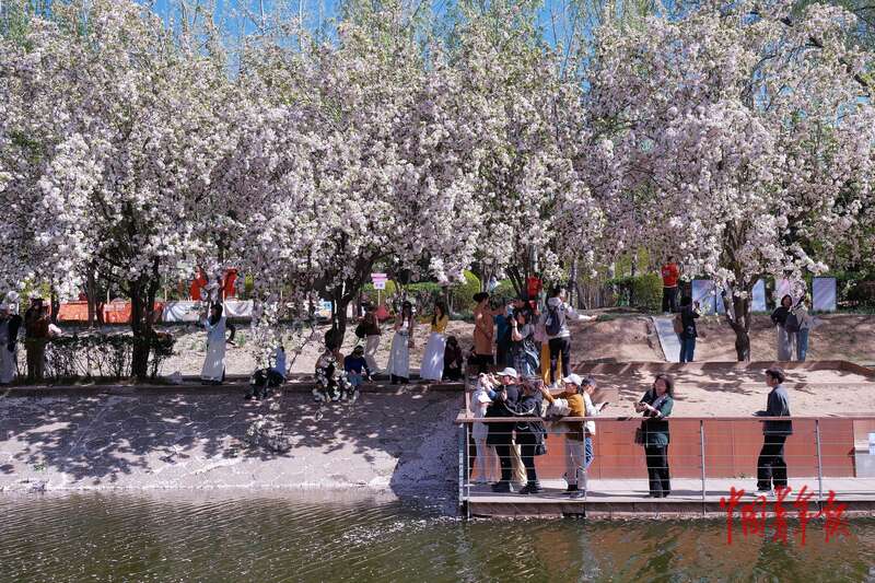 4月10日,北京朝阳,一场春雨过后,北京市气温明显转暖,迎来蓝天白云的晴好天气,在望京海棠花溪,成片的海棠花正值盛花期,吸引不少游客前来观赏、拍照,享受春日暖阳与清新空气。据了解,“花开北京·2026京津冀全民赏花季”系列活动于近日启幕,朝阳区北小河及沿岸、大望京公园等地共栽植樱花近6000株、海棠超2200株,形成“樱花水岸”与“海棠花溪”两大主题景观带,让游客们尽享春日花海。中青报·中青网记者 田嘉硕/摄