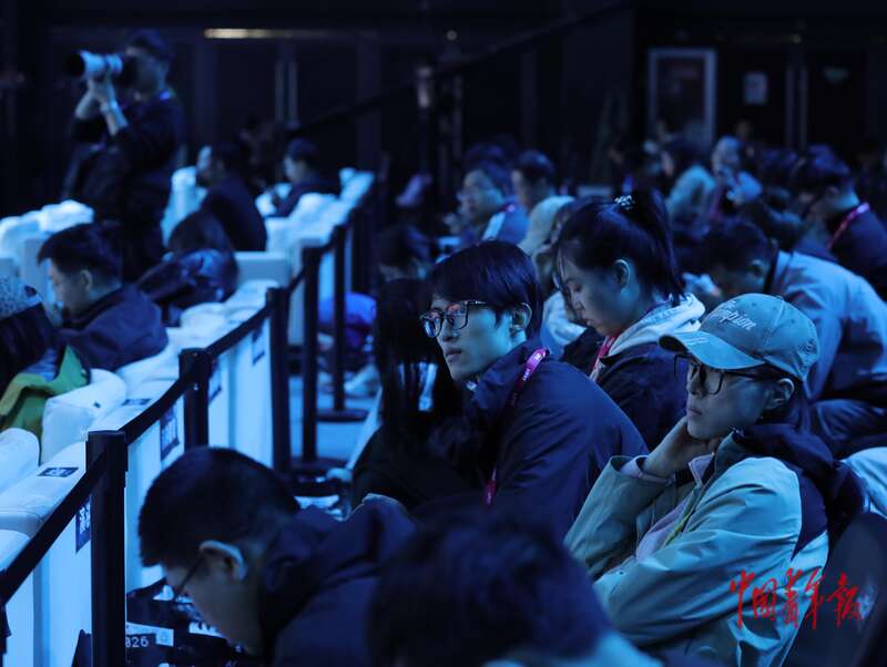 4月9日,北京亦庄,一个从深圳赶来听“AI未来大会”的大学生。他花费数百元买了大会的两日通票,坐在第一排听会。中青报·中青网记者 李强/摄