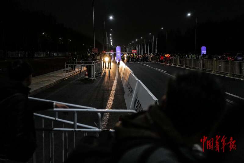 4月12日凌晨,北京经济技术开发区,2026人形机器人半程马拉松全流程全要素测试活动,现场做各种准备的工作人员。报名赛队中有70余支队伍参加此次测试,其中包含4支国际赛队。中青报·中青网记者 赵迪/摄
