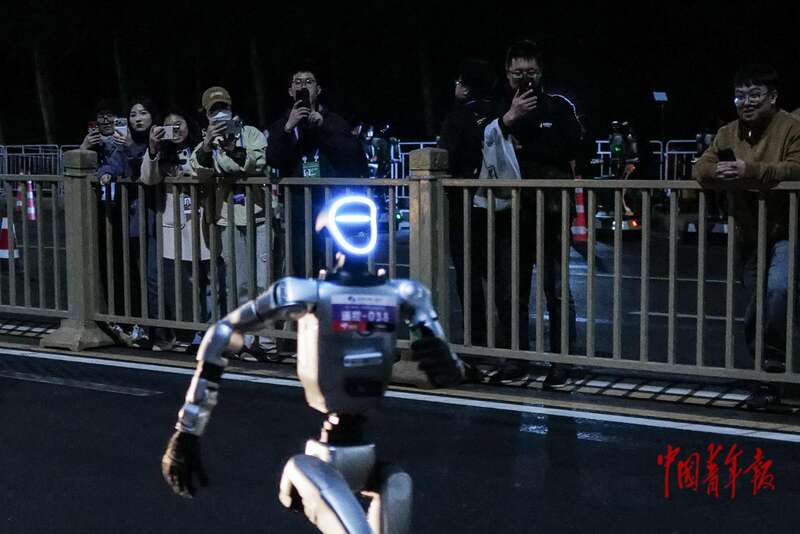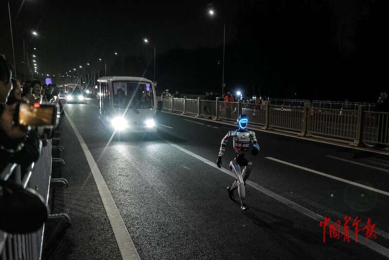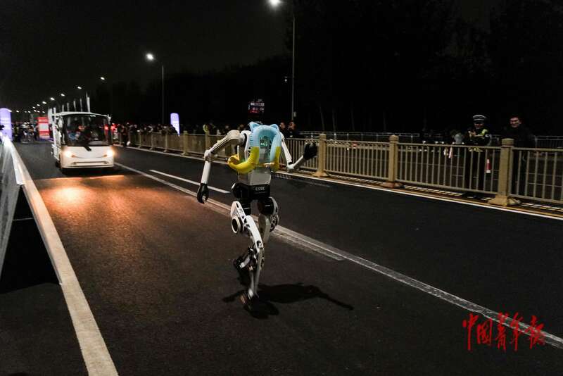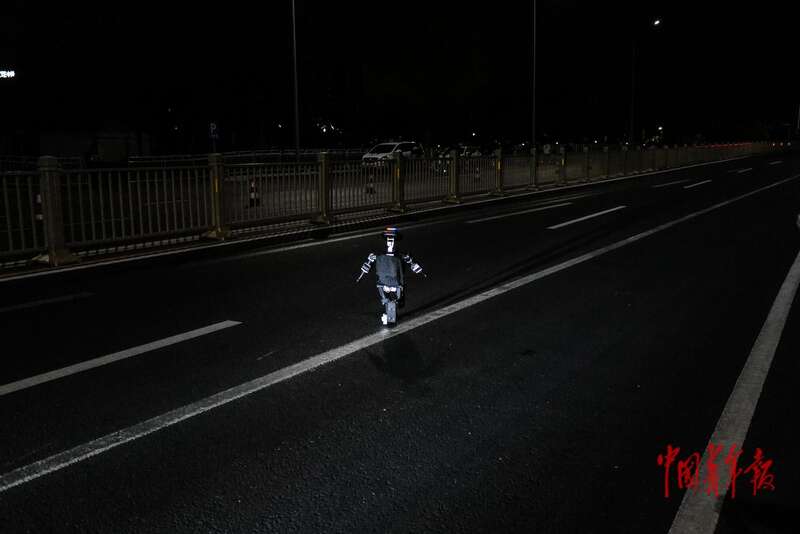 4月11日深夜,北京经济技术开发区,2026人形机器人半程马拉松全流程全要素测试活动,一台机器人正在进行实地测试。据介绍,2026人形机器人半程马拉松将于4月19日上午鸣枪开跑。为更好筹备赛事,4月11日晚至12日凌晨,主办方组织开展了2026人形机器人半程马拉松全流程全要素测试活动,全面模拟赛道通行、流程调度、设备协同、应急保障等核心场景。中青报·中青网记者 赵迪/摄