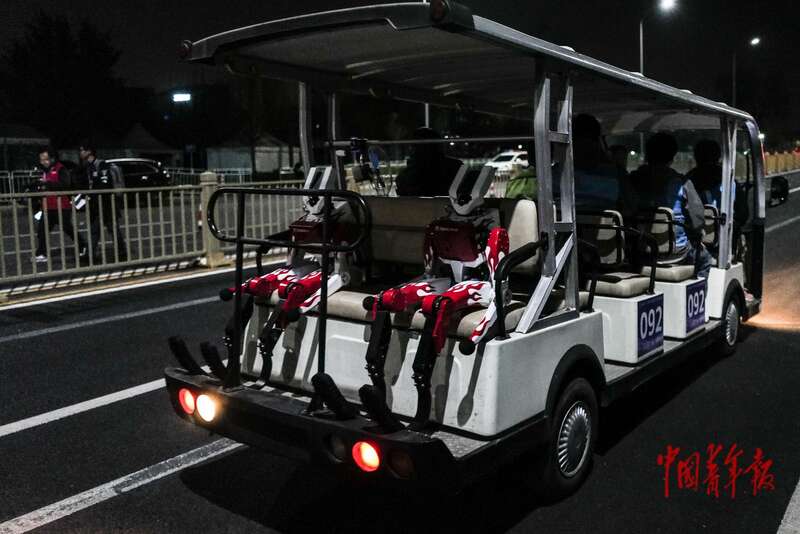 4月11日深夜,北京经济技术开发区,2026人形机器人半程马拉松全流程全要素测试活动,两台备用参赛机器人坐在电瓶车上。中青报·中青网记者 赵迪/摄