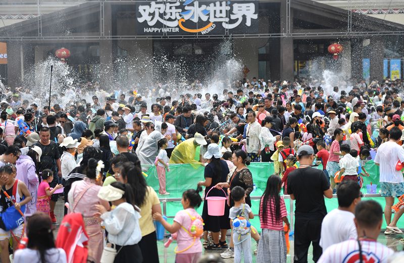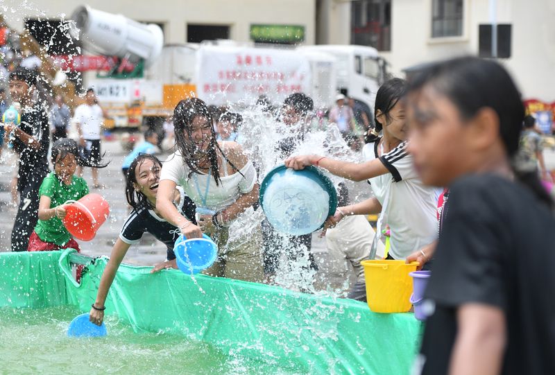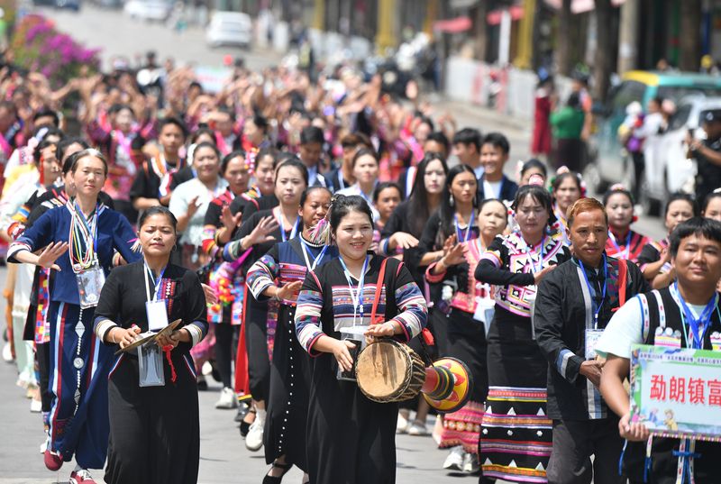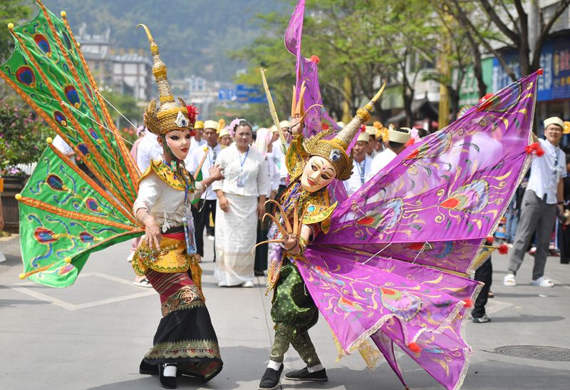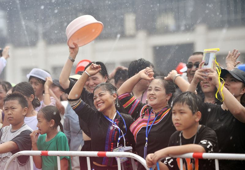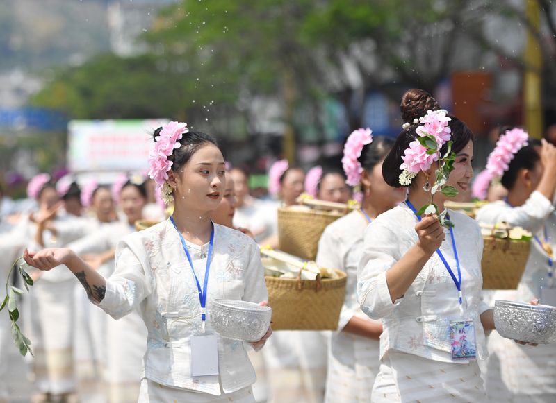 2026年4月11日,民众泼水送祝福。当日,云南省普洱市澜沧拉祜族自治县庆祝泼水节。当地的傣族、拉祜族、哈尼族、佤族等民众进行民族大联欢巡游,并与来自世界各地的游客同庆傣历1388年泼水盛典。 中新社记者 黄兴鸿 摄