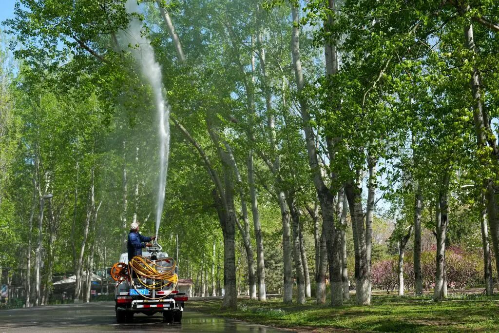 4月11日,在北京奥林匹克森林公园,工作人员在用加入了凝絮剂的水喷洒杨树。新华社记者 鞠焕宗 摄