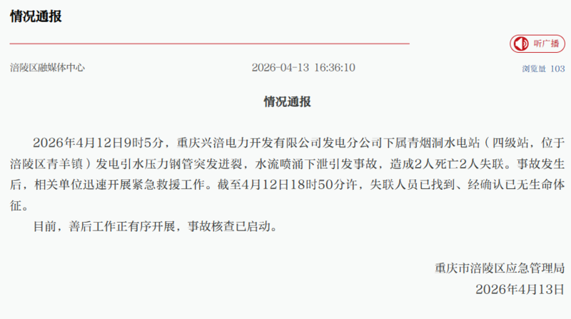 2026年4月12日9时5分,重庆兴涪电力开发有限公司发电分公司下属青烟洞水电站(四级站,位于涪陵区青羊镇)发电引水压力钢管突发迸裂,水流喷涌下泄引发事故,造成2人死亡2人失联。事故发生后,相关单位迅速开展紧急救援工作。截至4月12日18时50分许,失联人员已找到、经确认已无生命体征。