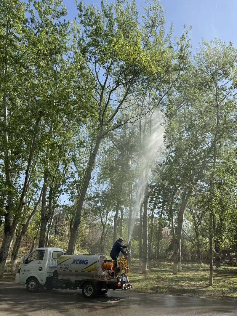 针对短期应急,北京总结出一套形象的口诀——“洗剪吹粘”。洗,即高压喷水冲洗树冠;剪,是整形修剪枯枝过密枝;吹,指地面湿化后配合清扫,防止二次飘飞;粘,则是今年进一步升级的“杀手锏”——凝絮剂。这款材料去年已开始试用,今年在技术、安全性和效果上均有明显提升。