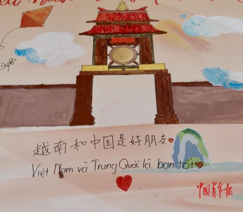 4月12日,广东省广州市第三少年宫,“中越少先队员共绘一幅画”活动上,中越两国少先队员在一处画的底部用中越双语书写“越南和中国是好朋友”。中青报·中青网 见习记者 王梓元/摄