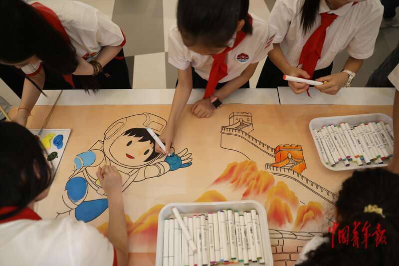 4月12日,广东省广州市第三少年宫,“中越少先队员共绘一幅画”活动在这里举行。越南青年来华“红色研学之旅”之“不忘初心”研学营少先队分团的少先队员、少先队辅导员和中国广东省广州市的少先队员、少先队辅导员等共同参与。画卷中,有中共一大会址、越中友谊宫等红色地标,有万里长城、天安门、越南文庙、顺化皇城等文化遗产,有复兴号高铁、天宫、越南金桥、地标塔81等两国现代化建设成果,寓意中越两国人文相亲、命运与共、情谊深厚,表达了两国少先队员传承红色基因、共创美好未来的共同心愿。中青报·中青网记者 陈剑/摄