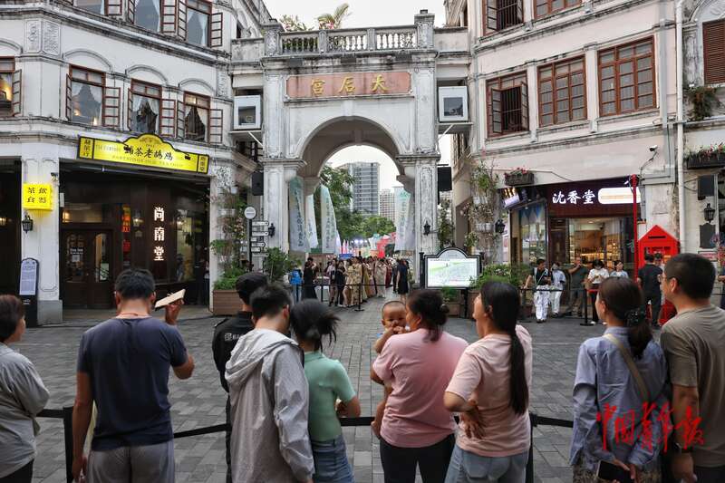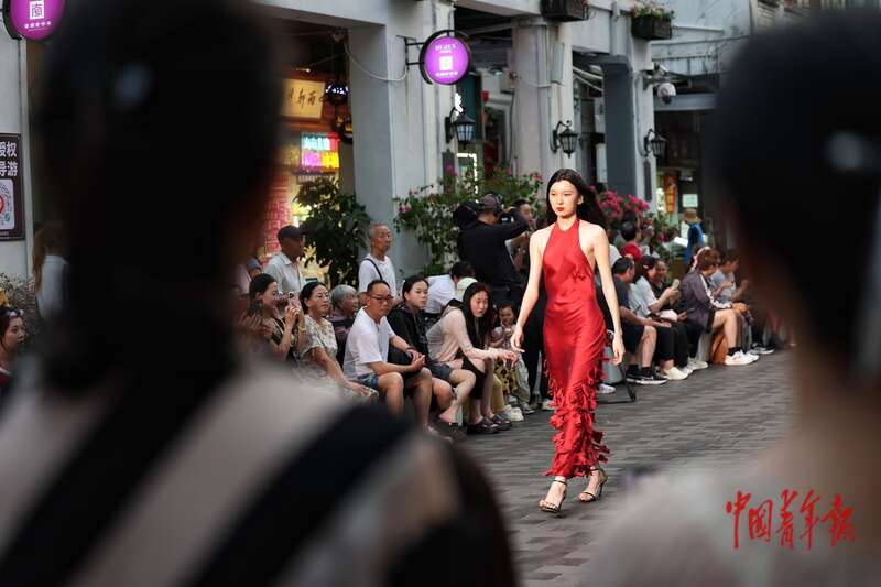 4月13日,海南海口骑楼老街,2026海南青年国际时装周秀场上,模特在走秀,吸引众多市民观看。中青报•中青网记者 曲俊燕/摄